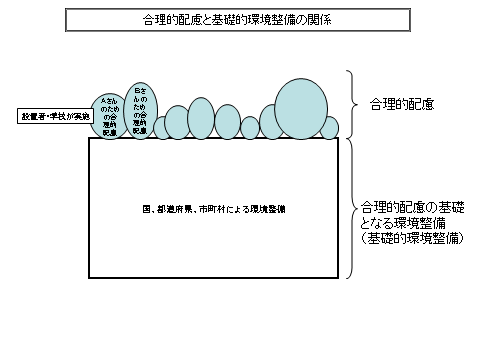 「合理的配慮」とは、障害のある子どもが、他の子どもと平等に「教育を受ける権利」を享有・行使することを確保するために、学校の設置者や学校が必要かつ適当な変更・調整を行うことで、障害のある子どもに対し、その状況に応じて学校教育を受ける場合に個別に必要とされるものであり、学校の設置者及び学校に対して、体制面、財政面において、均衡を失した又は過度の負担を課さないものです。
